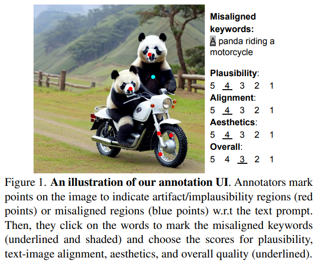 Lastly, annotators label the misaligned keywords and the four types of scores for plausibility, image-text alignment, aesthetic, and overall quality, respectively, on a 5-point Likert scale.