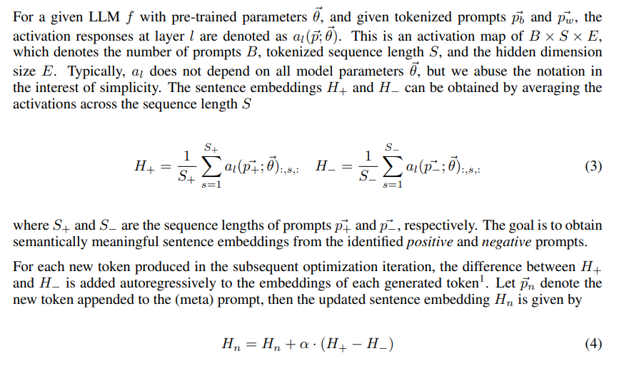 3.3 STEERING THE LLM GENERATION PROCESS At a higher level, given two prompts – positive and negative (identified through equation 2), our proposed steering can be considered as analogous to computing a hidden state gradient towards the positive prompt, effectively biasing the language generation away from the negative identified prompt in each optimization step. The intuition is to condition the LLM text outputs according to the language preferred by the downstream VLM. To this end, we show that the LLM outputs can be steered through simple arithmetic in the hidden states of the present-day LLMs.