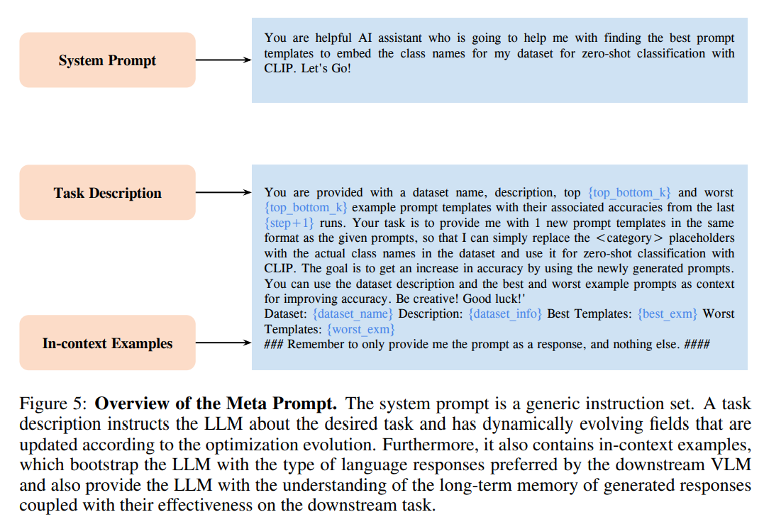 3.2 META-PROMPT The meta-prompt (c.f., Appendix Figure 5) is responsible for driving the iterative prompt optimization. Specifically, it consists of 3 distinct parts, which are described as follows: System prompt is a generic set of instructions that describe the task of the LLM. It helps a user to find the optimal prompts, improving the downstream task accuracy. The system prompt remains static for the entire optimization run. Task description is dynamically changing at each optimization step. It consists of a description of what is included in the main body of the prompt, e.g., what is expected from the LLM (i.e., a prompt), a downstream task name, task description, quantity (and actual) best and worst prompt templates as in-context examples, with their associated fitness, obtained through equation 2. In-context examples serve to bootstrap the LLM to the type of output that is expected. In each optimization step, we task the LLM to provide us with 10 candidate solutions (prompts). Each prompt is evaluated w.r.t. a fitness function to obtain a (classification) score. We keep a global history of the prompts (and associated fitness) generated during all the previous optimization steps and at each optimization step i, the newly generated prompts and all the previous prompts are ranked according to their respective fitness score. For the next optimization step i + 1, topk, and bottomk prompts (we choose k = 5) are selected as in-context demonstrations and plugged into the metaprompt together with their respective accuracies. The intuition behind keeping a global history of prompts is to provide the LLMs with long-term knowledge about what types of prompts have been effective for the VLM so that it can model its responses according to them
