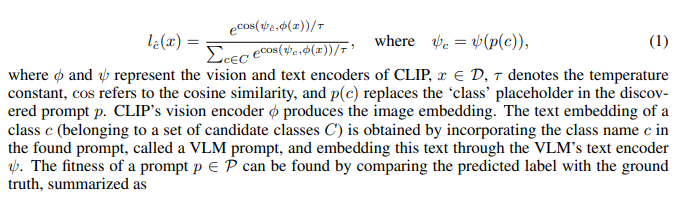 For CLIP (Radford et al., 2021), the zero-shot likelihood of class cˆ for each discovered prompt p ∈ P during an optimization step can be found by