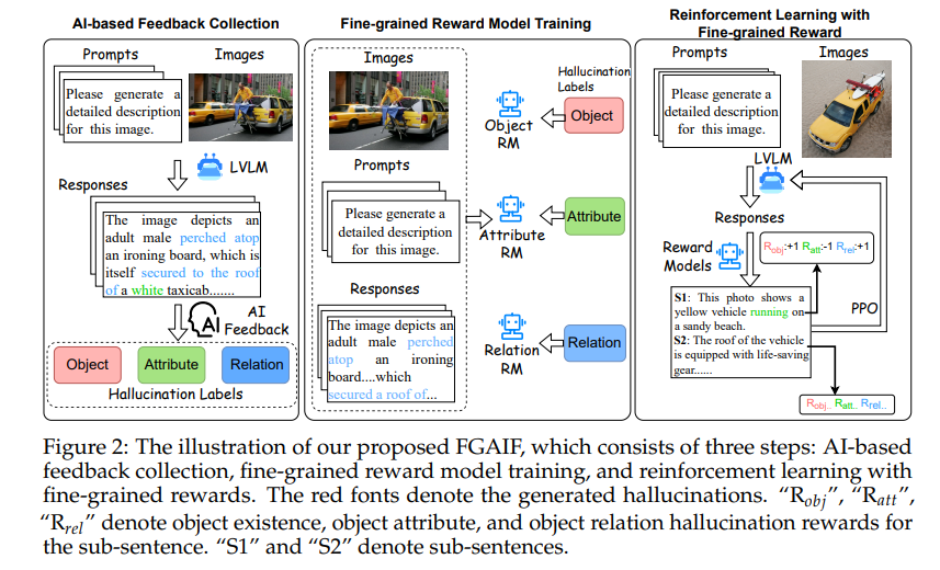 To handle these limitations, we propose an innovative method to align modalities in LVLMs through Fine-Grained Artificial Intelligence Feedback (FGAIF), which mainly consists of three steps: AI-based Feedback Collection, Fine-grained Reward Model Training, and Reinforcement Learning with Fine-grained Reward.