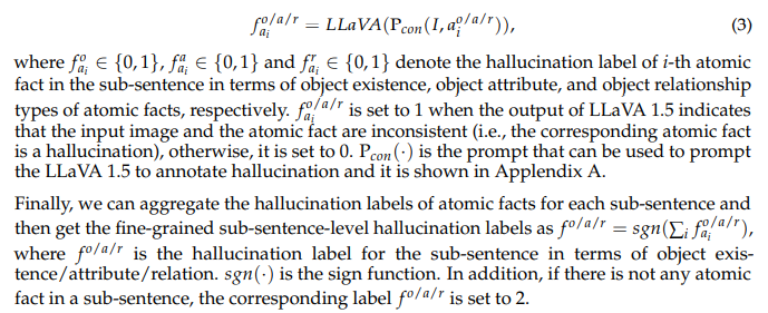 Thereafter, to get the label of each type of hallucination for each sub-sentence, we need to verify whether the atomic fact is consistent with the input image.