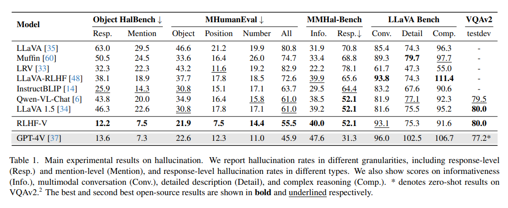 Experimental results show that RLHF-V effectively reduces the hallucination count of LLaVA by 13.8 relative points, as well as the hallucination rate by 5.9 relative points.