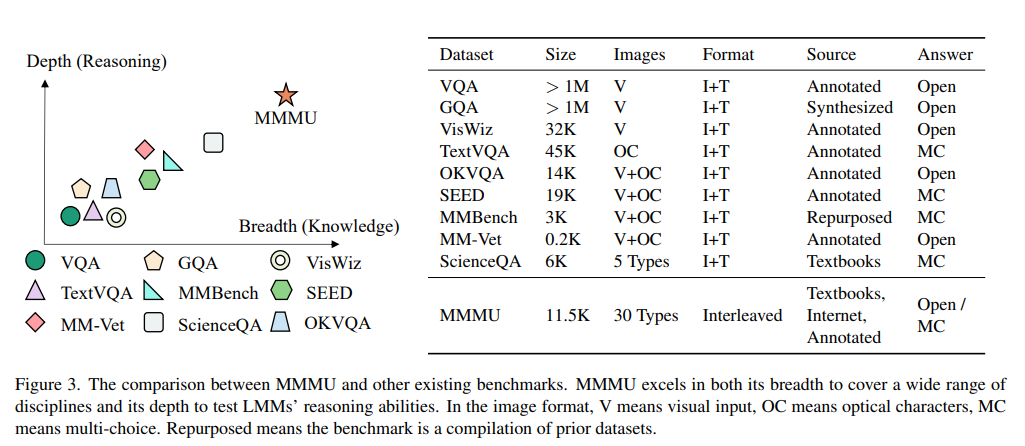 3. The MMMU Benchmark 3.1. Overview of MMMU We introduce the Massive Multi-discipline Multimodal Understanding and Reasoning (MMMU) benchmark, a novel benchmark meticulously curated to assess the expert-level multimodal understanding capability of foundation models across a broad scope of tasks. Covering 30 subjects across 6 disciplines, including Art, Business, Health & Medicine, Science, Humanities & Social Science, and Tech & Engineering, and over 183 subfields. The detailed subject coverage and statistics are detailed in Figure 7. The questions in our benchmark were manually collected by a team of 50 college students (including coauthors) from various disciplines and subjects, drawing from online sources, textbooks, and lecture materials. MMMU, constituting 11.5K questions, is divided into a few-shot development set, a validation set, and a test set. The few-shot development set includes 5 questions per subject, and the validation set, useful for hyperparameter selection, contains approximately 900 questions, while the test set comprises 10.5K questions. MMMU is designed to measure three essential skills in LMMs: perception, knowledge, and reasoning. Our aim is to evaluate how well these models can not only perceive and understand information across different modalities but also apply reasoning with subjectspecific knowledge to derive the solution. Our MMMU benchmark introduces four key challenges to multimodal foundation models, as detailed in Figure 1. Among these, we particularly highlight the challenge stemming from the requirement for both expert-level visual perceptual abilities and deliberate reasoning with subjectspecific knowledge. This challenge is vividly illustrated through our tasks, which not only demand the processing of various heterogeneous image types but also necessitate a model’s adeptness in using domain-specific knowledge to deeply understand both the text and images and to reason. This goes significantly beyond basic visual perception, calling for an advanced approach that integrates advanced multimodal analysis with domain-specific knowledge. 3.2. Data Curation Process Data Collection. Our benchmark collection takes three stages. Firstly, we go through the common university majors to decide what subjects should be included in our benchmark. The selection is based on the principle that visual inputs should be commonly adopted in the subjects to provide valuable information. Through this principle, we rule out a few subjects like law and linguistics because it is difficult to find enough relevant multimodal problems in these subjects. Consequently, we select 30 subjects from six different disciplines. In the second stage, we recruit over 50 university students, including co-authors, specializing in these majors as annotators to assist in question collection. They collect multimodal questions from major textbooks and online resources, creating new questions based on their expertise where necessary. The annotators are instructed to adhere to copyright and license regulations, avoiding data from sites prohibiting copy and redistribution. Given the arising data contamination concerns of foundation models, the annotators are advised to select questions without immediately available answers, such as those with answers in separate documents or at the end of textbooks. This process results in a diverse collection of 13K questions from various sources. The detailed annotation protocol is in Appendix A. Data Quality Control. To further control the quality of our data, we perform two steps of data cleaning. In the first stage, lexical overlap and source URL similarity are employed to identify potential duplicate problems. These suspected duplicates were then reviewed by the authors to identify and eliminate any duplications. The second stage involves distributing the problems among different co-authors for format and typo checking. This step requires authors to ensure adherence to a standardized format, undertaking necessary corrections where deviations are found. In the third and final stage, the authors categorize the problems into four difficulty levels: very easy, easy, medium, and hard. Approximately 10% of the problems, classified as very easy and not aligning with our design criteria due to their simplistic nature, are excluded from the benchmark. This rigorous process plays a crucial role in maintaining the quality and difficulty of the problem set. 3.3. Comparisons with Existing Benchmarks To further distinguish the difference between MMMU and other existing ones, we elaborate the benchmark details in Figure 3. From the breadth perspective, the prior benchmarks are heavily focused on daily knowledge and common sense. The covered image format is also limited. Our benchmark aims to cover college-level knowledge with 30 image formats including diagrams, tables, charts, chemical structures, photos, paintings, geometric shapes, music sheets, medical images, etc. In the depth aspect, the previous benchmarks normally require commonsense knowledge or simple physical or temporal reasoning. In contrast, our benchmark requires deliberate reasoning with college-level subject knowledge