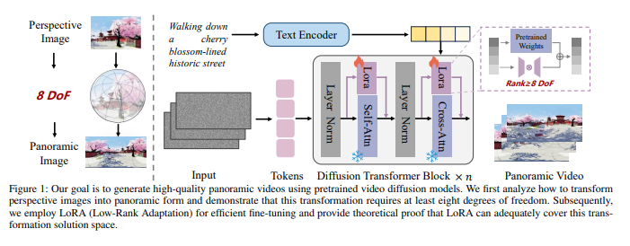 논문은 Low-Rank Adaptation (LoRA)의 성공에 착안하여, 파노라마 비디오 생성을 원근 뷰로부터의 적응(adaptation) 문제, 즉 스타일 변환 작업으로 재구성할 것을 제안