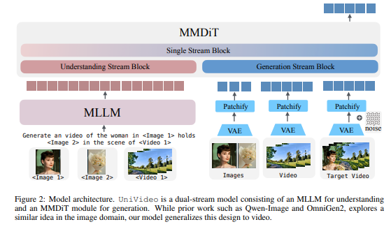 UniVideo는 시각적 일관성을 유지하면서 instruction 지시르를 정확하게 해석하기 위해 두 개의 듀얼 스트림 구조