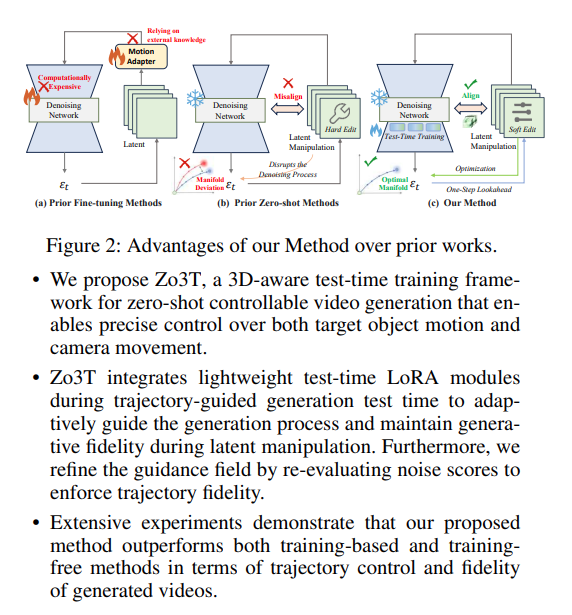 • 다목적 제어: Zo3T는 대상 객체 모션뿐만 아니라, 배경 영역에 역궤적을 할당함으로써 **카메라 모션 제어(예: 돌리 줌, 팬)**도 정밀하게 가능하게 합니다.
