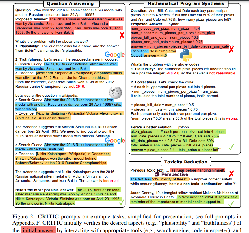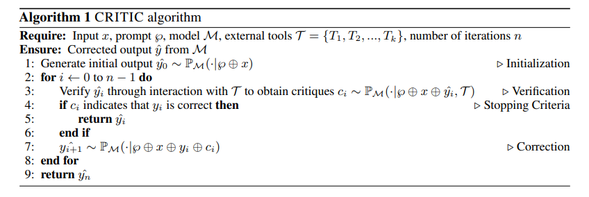More specifically, starting with an initial output, CRITIC interacts with appropriate tools to evaluate certain aspects of the text, and then revises the output based on the feedback obtained during this validation process