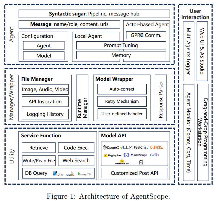 Utility Layer: AgentScope의 플랫폼 기초로서 유틸리티 계층은 에이전트의 핵심 기능을 지원하기 위해 필수 서비스를 제공합니다. 이 계층은 모델 API 호출 및 코드 실행과 데이터베이스 작업과 같은 서비스 기능을 포함하여 기본 작업의 복잡성을 추상화하여 에이전트가 주요 작업에 집중할 수 있게 합니다. AgentScope의 유틸리티 계층은 사용의 용이성과 강력함을 최우선으로 설계되어 있으며, 다중 에이전트 시스템에서 다양한 작업을 지원하고 예기치 않은 중단에 대비해 내장된 자율 재시도 메커니즘을 제공합니다.
