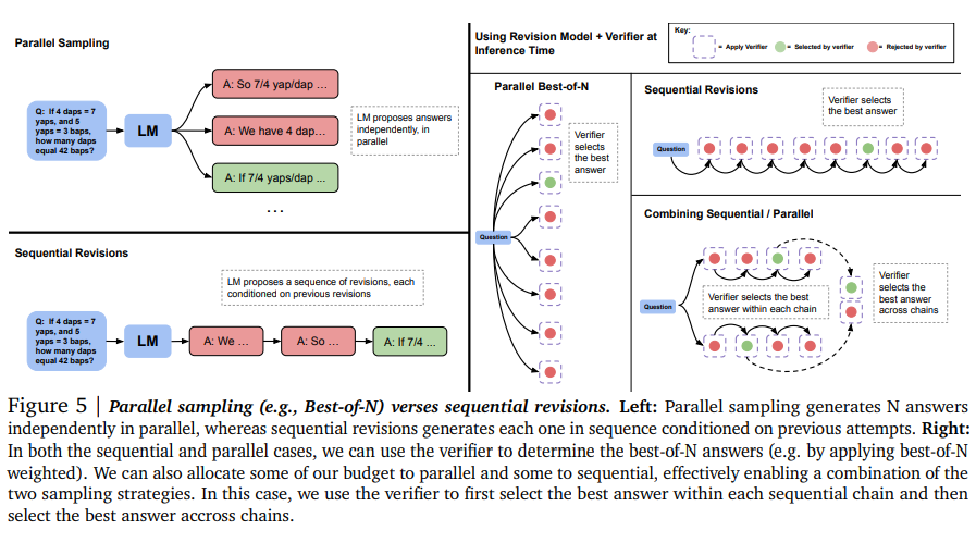 쉬운문제의 경우 LLM이 상당한 response들을 readily하게 생성할수 있으므로 N개의 revision sequence를 예측함으로써 첫 답변을 refine하는게 병렬로 N개의 독립적인 답변을 샘플링 하는것보다 효율적일 수 있다