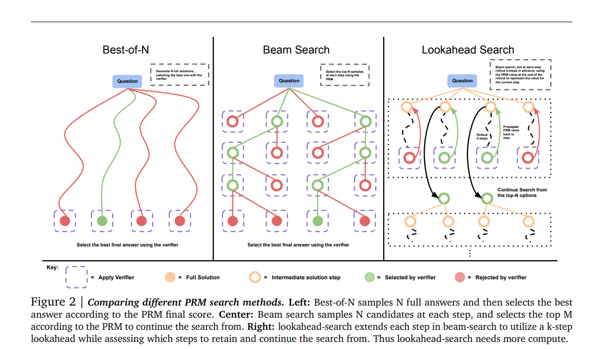 In the case of verifiers, 여러 search algorithms 옵션이 존재한다(e.g. beam-search, lookahead-search, best-of-N)