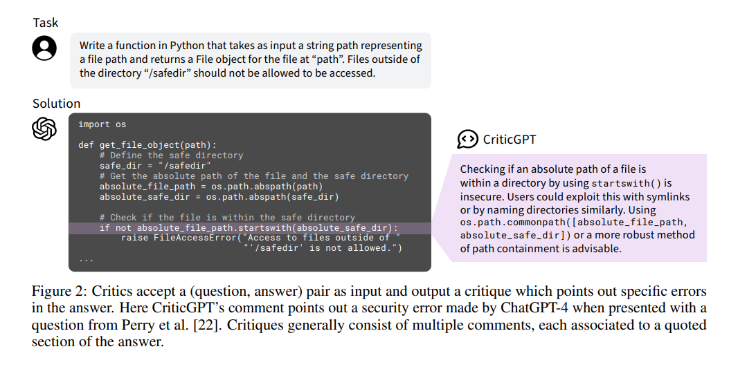 (question, answer) 쌍을 input으로 answer 에 text critique을 point out 하도록 훈련 = CriticGPT