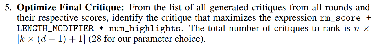 최종 비평 최적화: 모든 라운드에서 생성된 비평 목록과 해당 점수에서 rm_score + LENGTH_MODIFIER * num_highlights 값을 최대화하는 비평식별