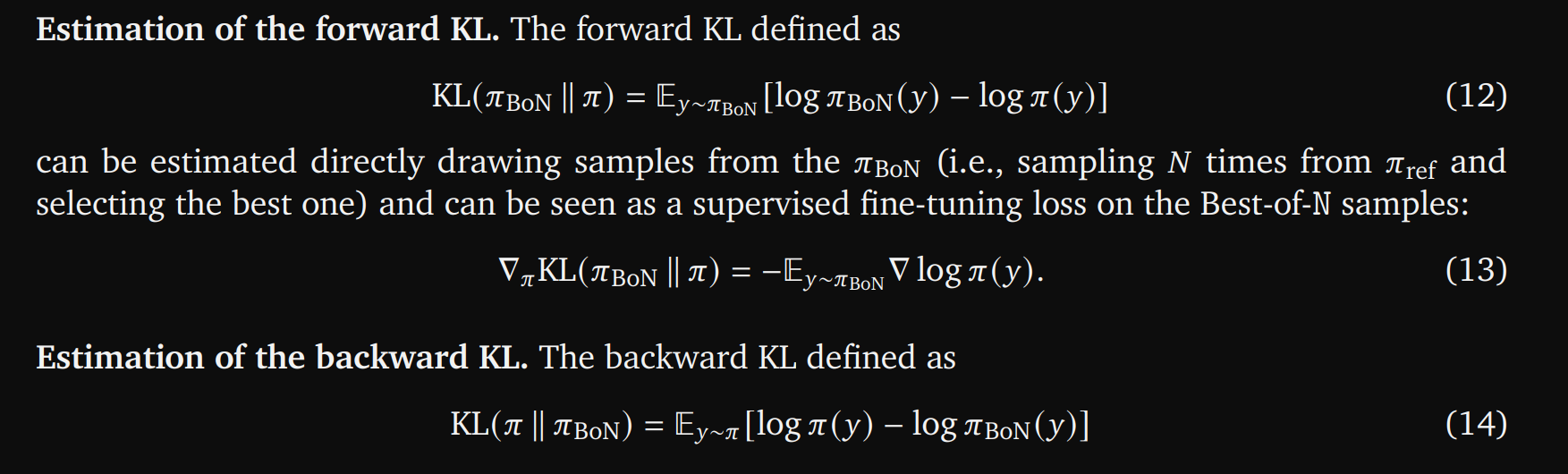 Best-of-N 샘플링. 실제로, 생성 품질을 향상시키기 위해 자주 사용되는 간단한 inference 접근법은 Best-of-N 샘플링이다. 이는 𝑁개의 후보 생성을 참조 모델에서 추출하고 (typically, supervised fine-tuned) , 보상 모델에 따라 가장 높은 보상(by reward model)을 받은 생성을 선택하는 방식이다. 이 전략은 경험적으로 우수한 보상-KL 균형을 달성하지만, 계산 비용을 𝑁배 증가시킨다.