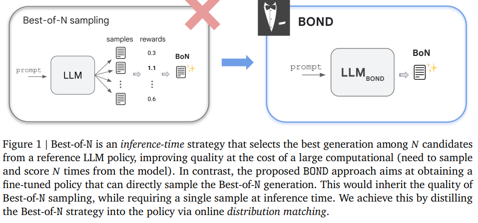 simple하고 strong inference-time 전략은 Best-of-N 샘플링이 있는데, 이는 𝑁개의 후보 중에서 가장 좋은 생성을 선택하는 방법으로 Best-of-N의 계산 복잡도를 줄이면서도 이 방법을 모방하려는 새로운 RLHF 알고리즘인 Best-of-N Distillation(BOND)을 제안