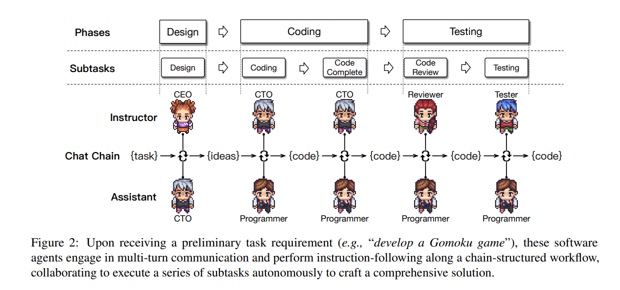 https://arxiv.org/pdf/2307.07924v5https://github.com/OpenBMB/ChatDevchat-powered software- development framework를 의미 Technically, to facilitate cooperative communication,협력적 커뮤니케이션을 촉진시키기 위해 ChatDev introduces chat chain to further break down each phase into smaller and manageable subtasks,채팅 chain을 사용해 각 단계를 subtask로 나누는 which guides multi-turn communications between different roles to propose ..