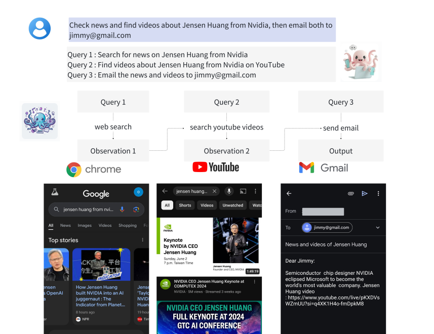 nvidia A100 gpu 1개 사용 planner-action 프레임워크두개의 요소로 나눠진다1. planner agent엣지 디바이스를 위해 최적화된 octo-planner2. action agentfunction 실행을 위한 octupus 모델을 사용한 action agent 서브 스텝들(sub-steps)의 시퀸스로 나눠진 task의 질문(query)에 대한 응답을 planner가 생성하고 이를 실제로 실행하는 과정으로 이루어진다리소스가 제한된 환경에서 실행(성능 최적화 및, 컴퓨팅 최적화)시키기 위해 in-context 능력에 집중하기 보단(스케일링의 증가로 나타남) finetuning을 통한 모델을 사용한다.실제 데스크탑에서 12퍼센트 모바일 앱에서 46퍼였던 성능이 파인튜닝이후 훈련 데이터..